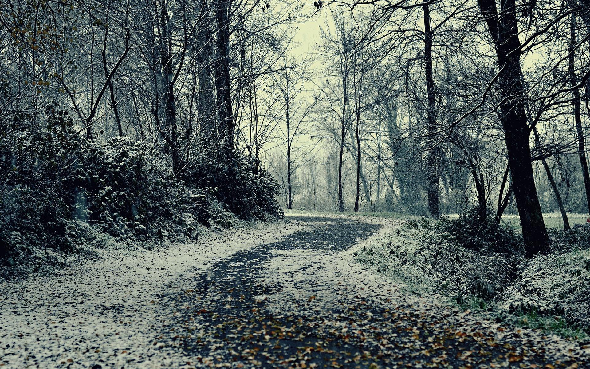 Обои Снег припорошил опавшие листья на аллее