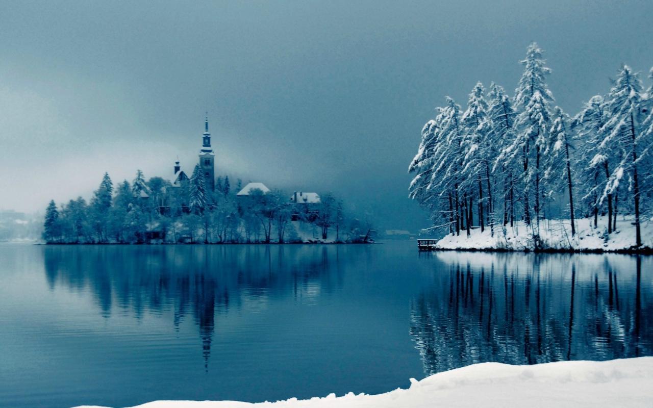 Обои Заснеженный остров с церковью посреди озера
