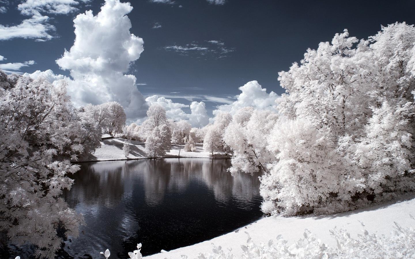 Обои Покрытые инеем деревья на берегу озера