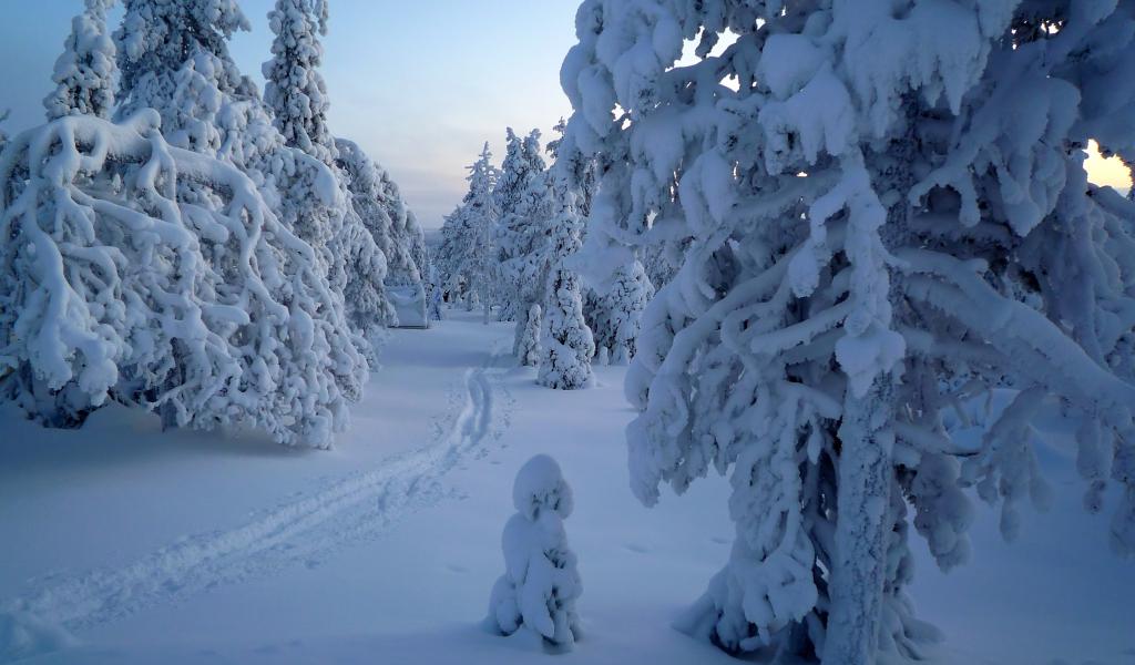 Обои Зимнее солнце освещает покрытые снегом ветки в лесу