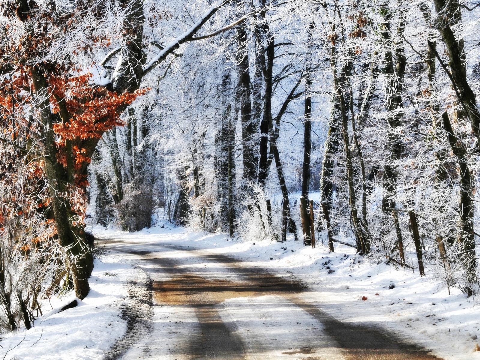 Обои Дорога в заснеженном зимнем лесу
