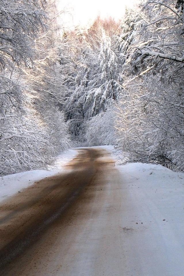 Обои Дорога в заснеженном зимнем лесу