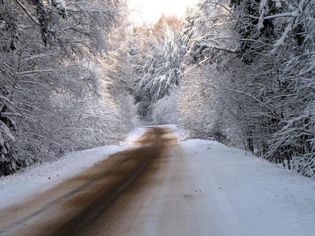 Обои Дорога в заснеженном зимнем лесу