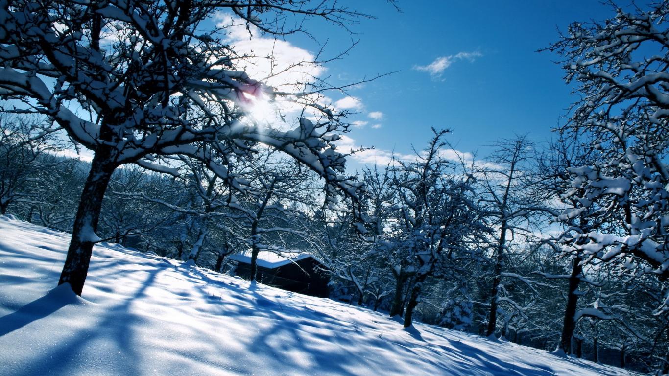 Обои Домик в заснеженном саду