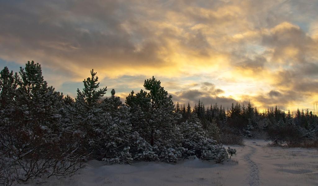 Обои Закат в молодом лесу