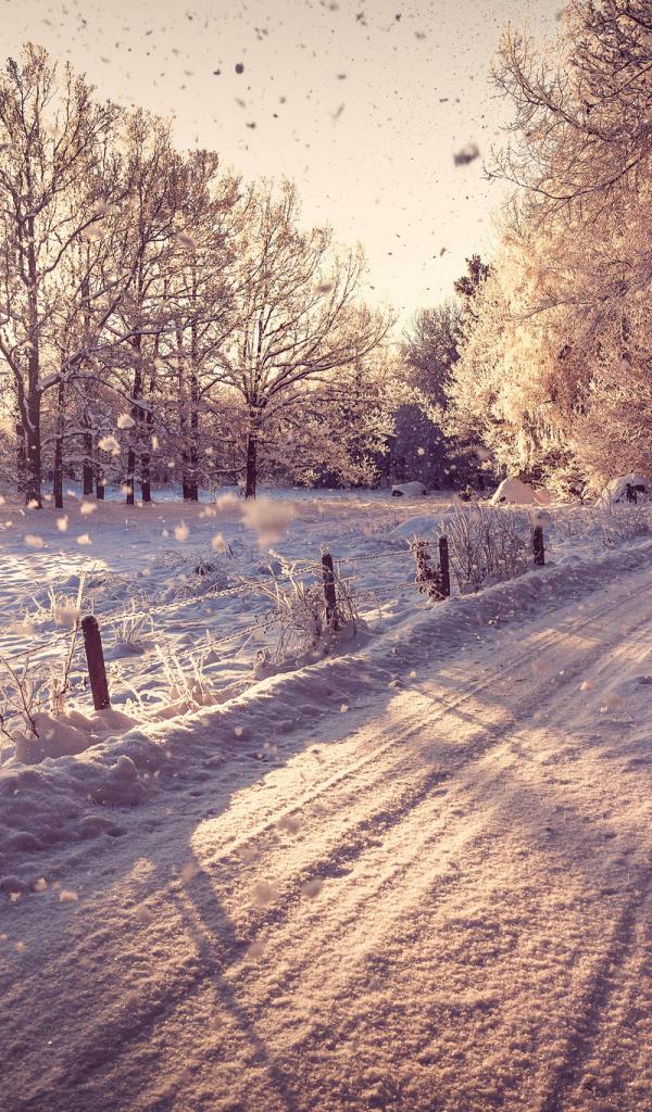 Обои Снег, Дорога, Зимняя ночь, Солнце