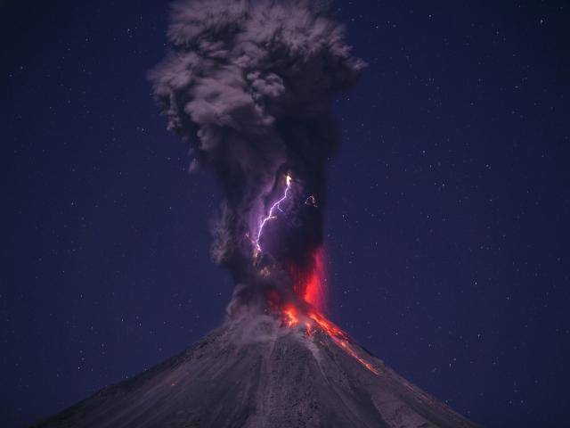 Обои Выброс пепла из вулкана на фоне звездного неба