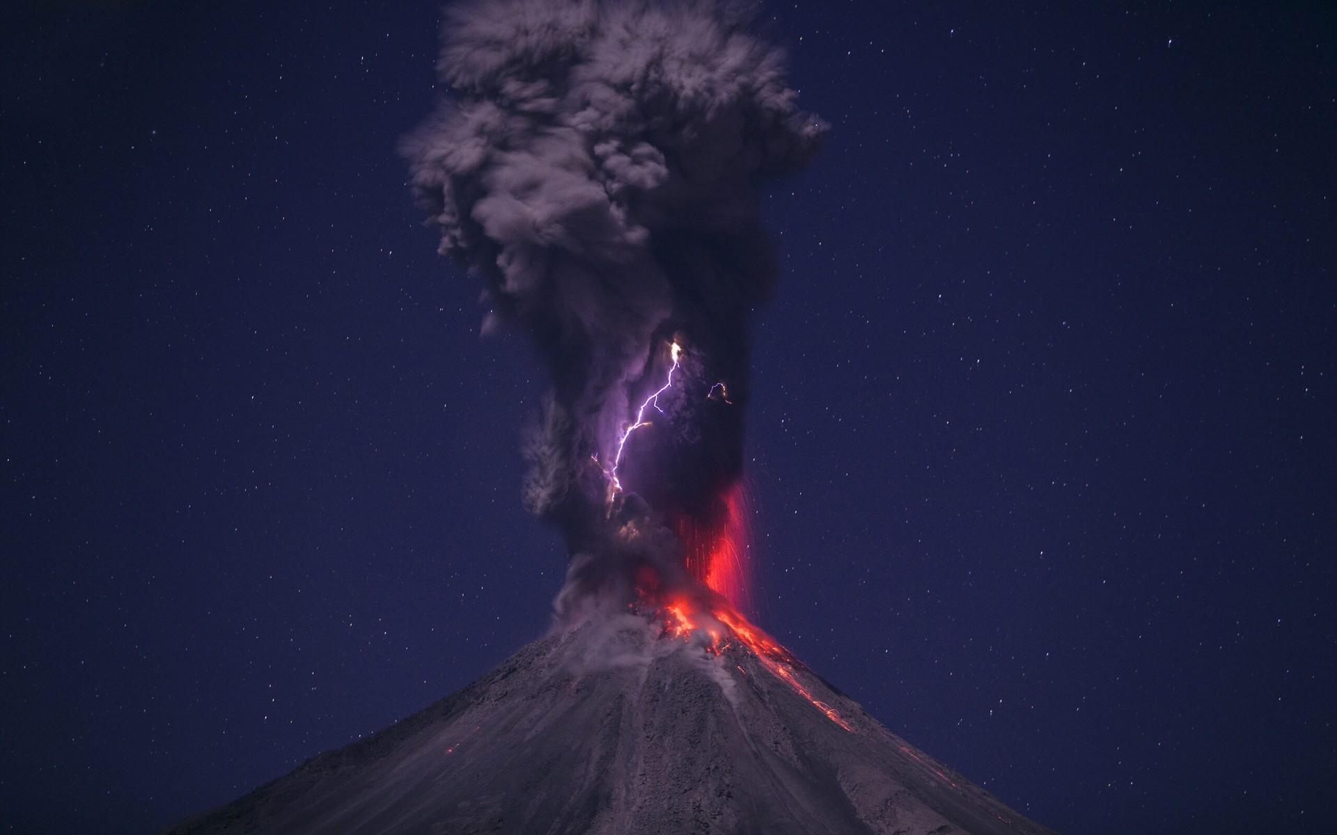 Обои Выброс пепла из вулкана на фоне звездного неба