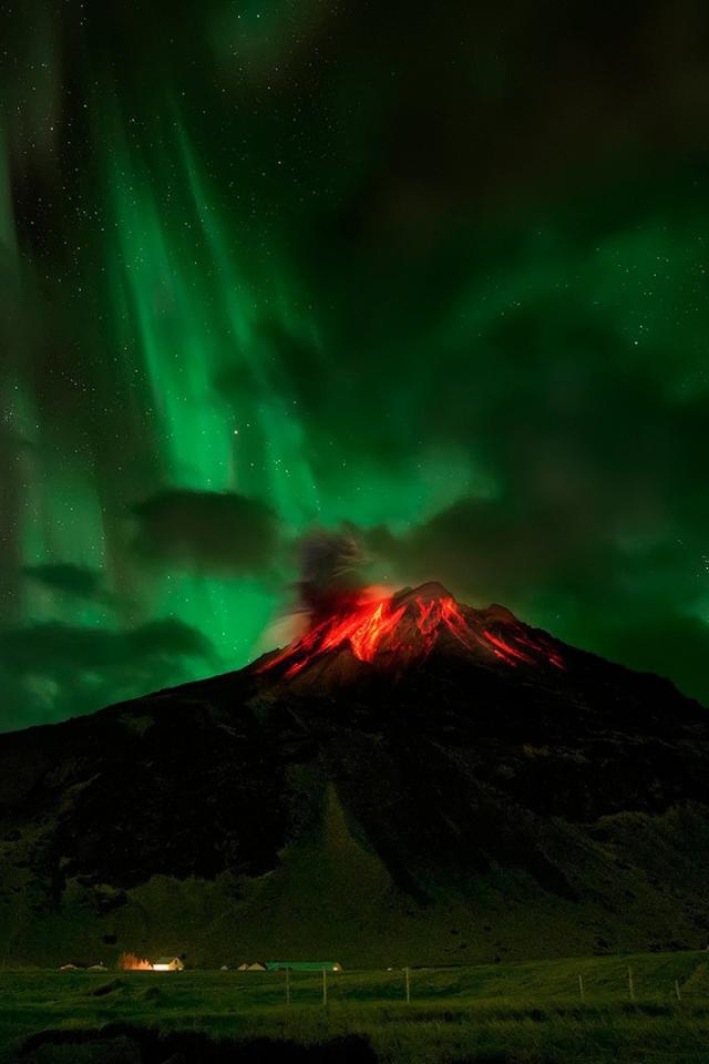Обои Северное сияние над пылающим вулканом