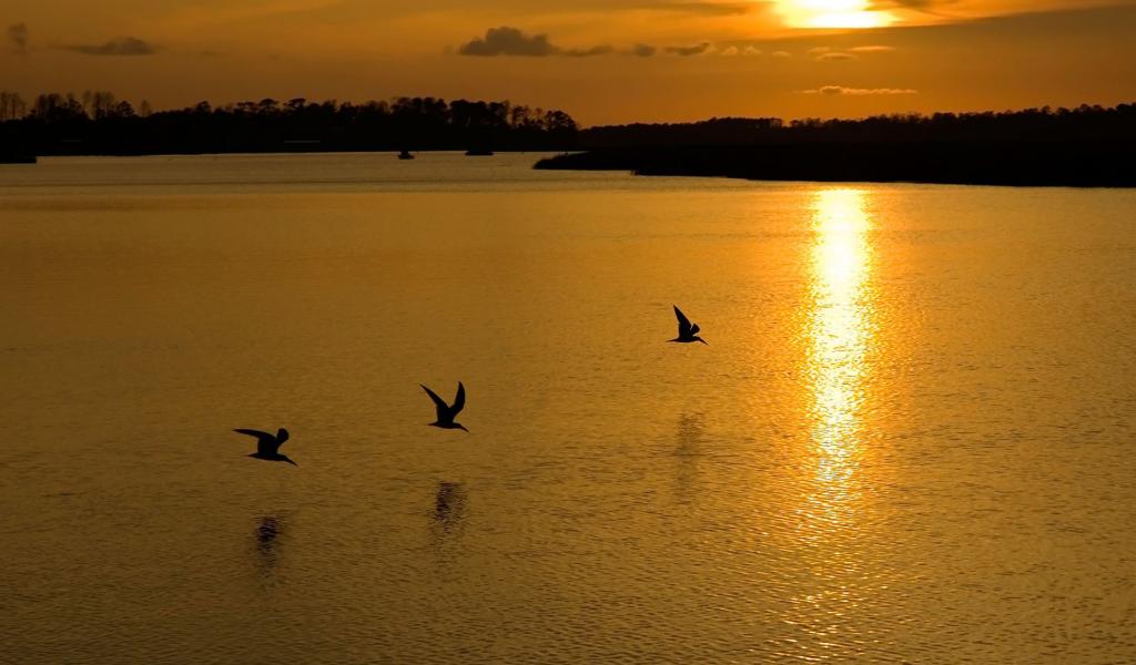 Обои Птицы на озере во время заката