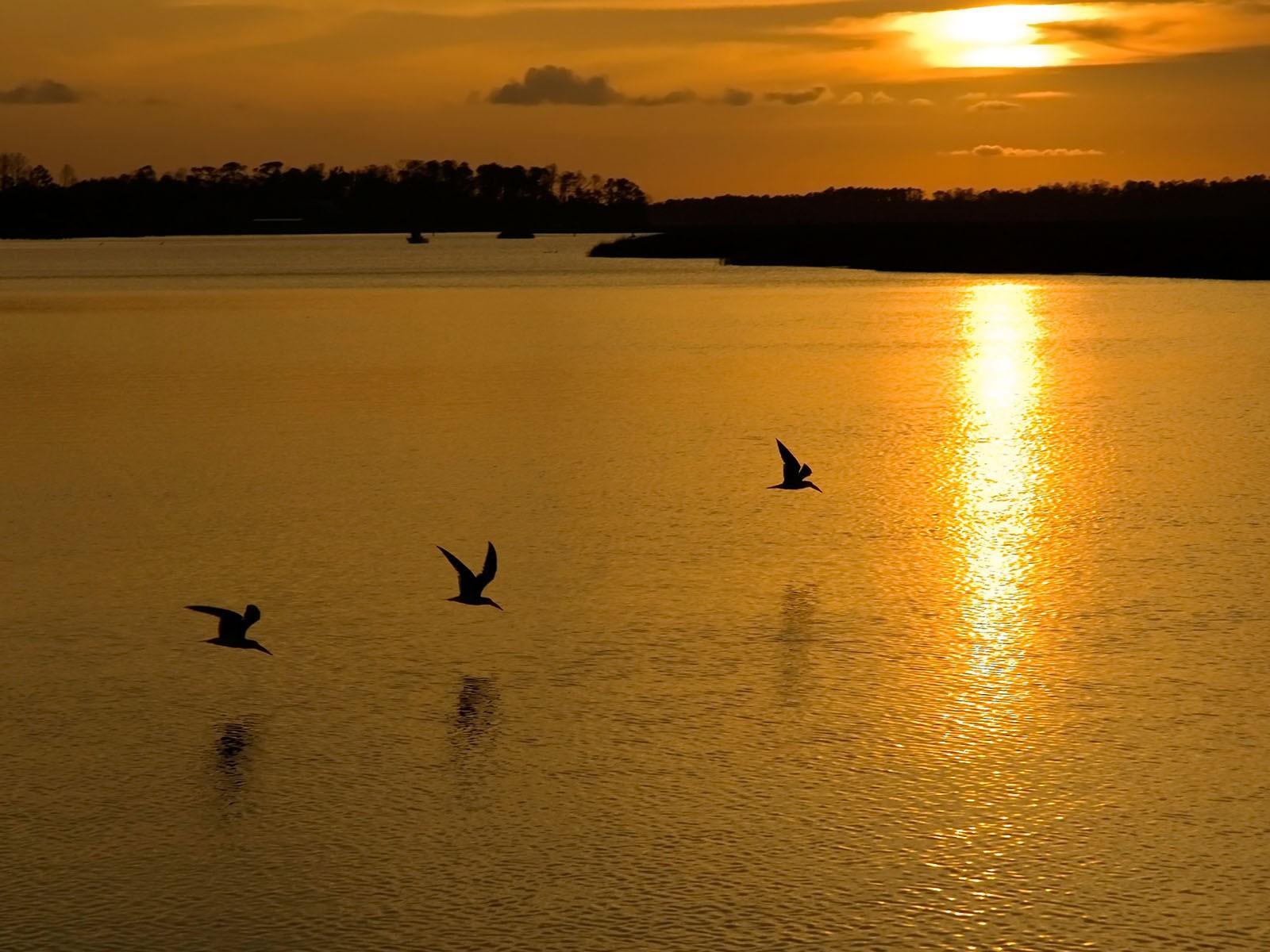 Обои Птицы на озере во время заката