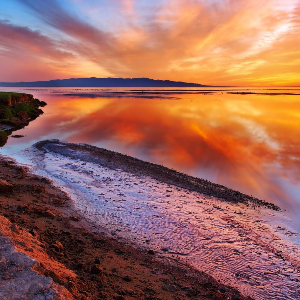 Обои Оранжевые облака отражаются в зеркальной глади воды