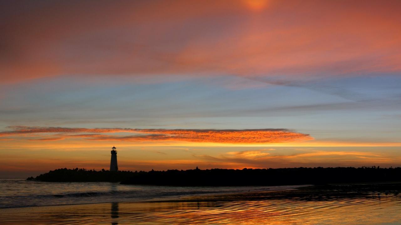 Обои Силуэт маяка на фоне оранжевых облаков