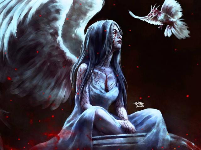 Обои Фентези птица подлетела к девушке, художник NanFe