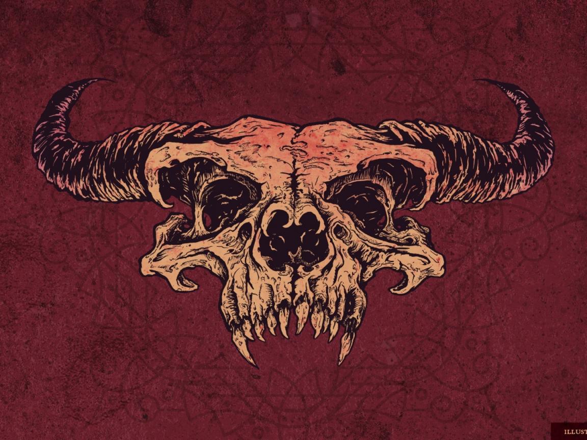 Обои Скелет, Красный фон, Череп, рога