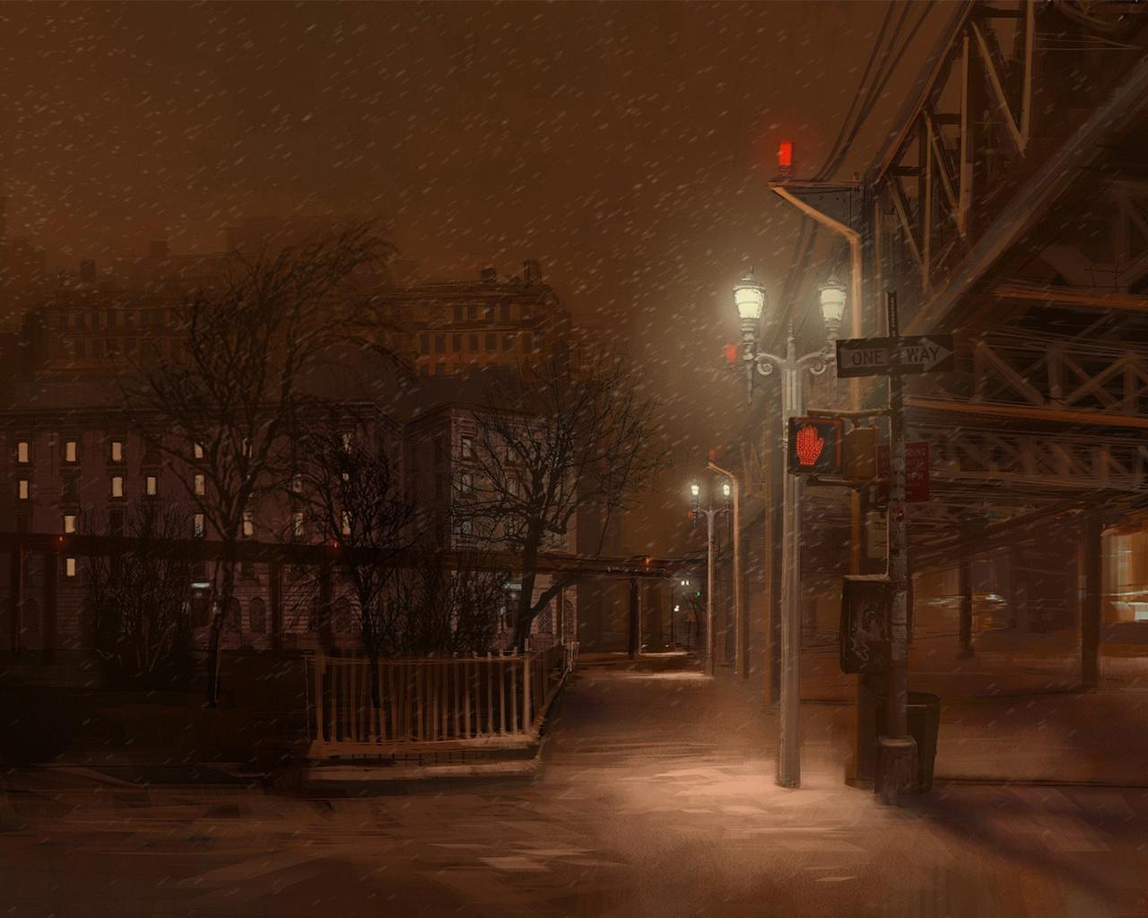 Обои Мелкий снег на ночной улице