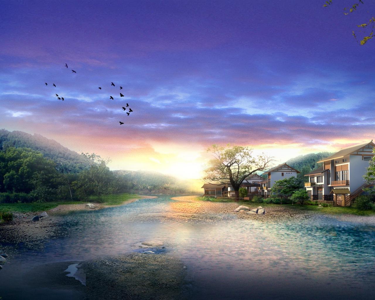Обои Домики у реки