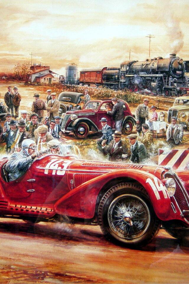 Обои Ретро автомобиль и локомотив на рельсах