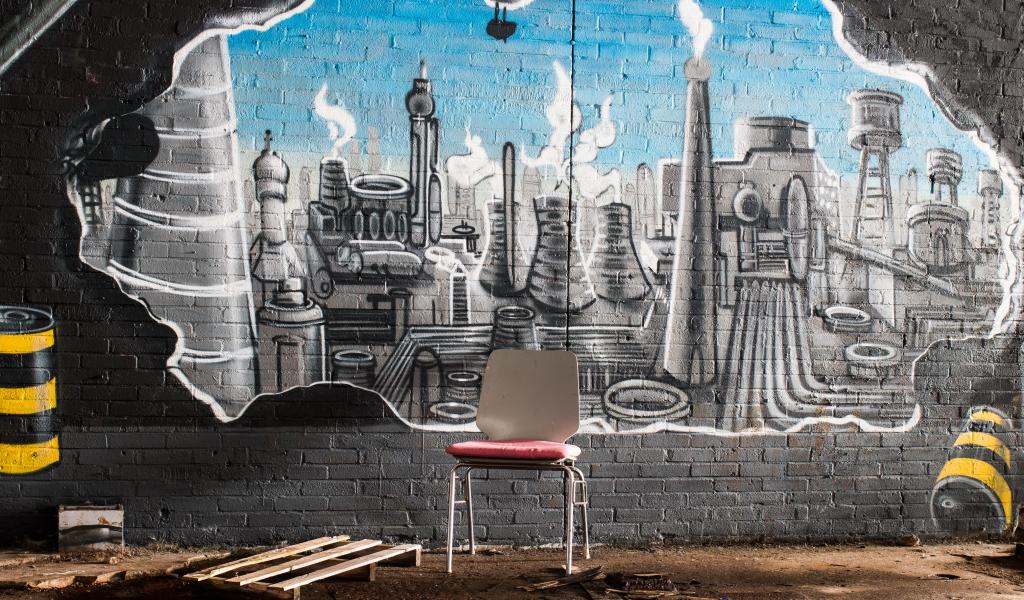 Обои Стул стоит у кирпичной стены с граффити