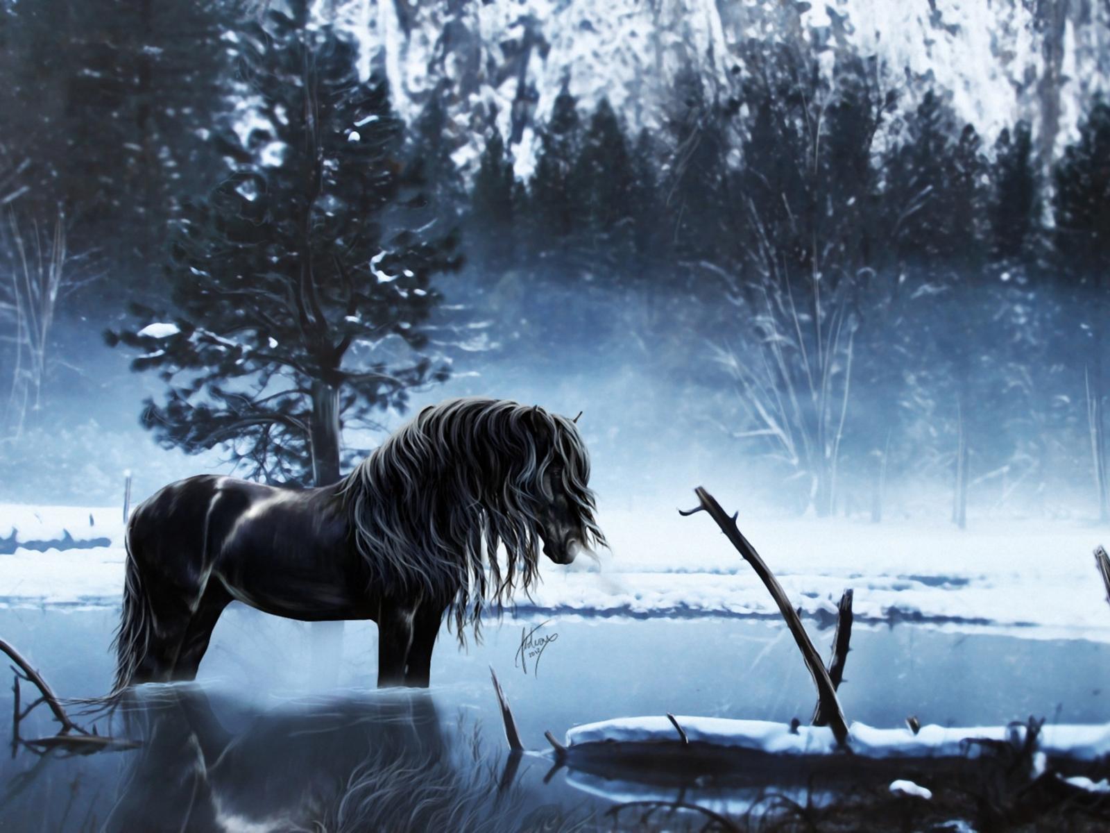 Обои Снег, Деревья, Вода, волк