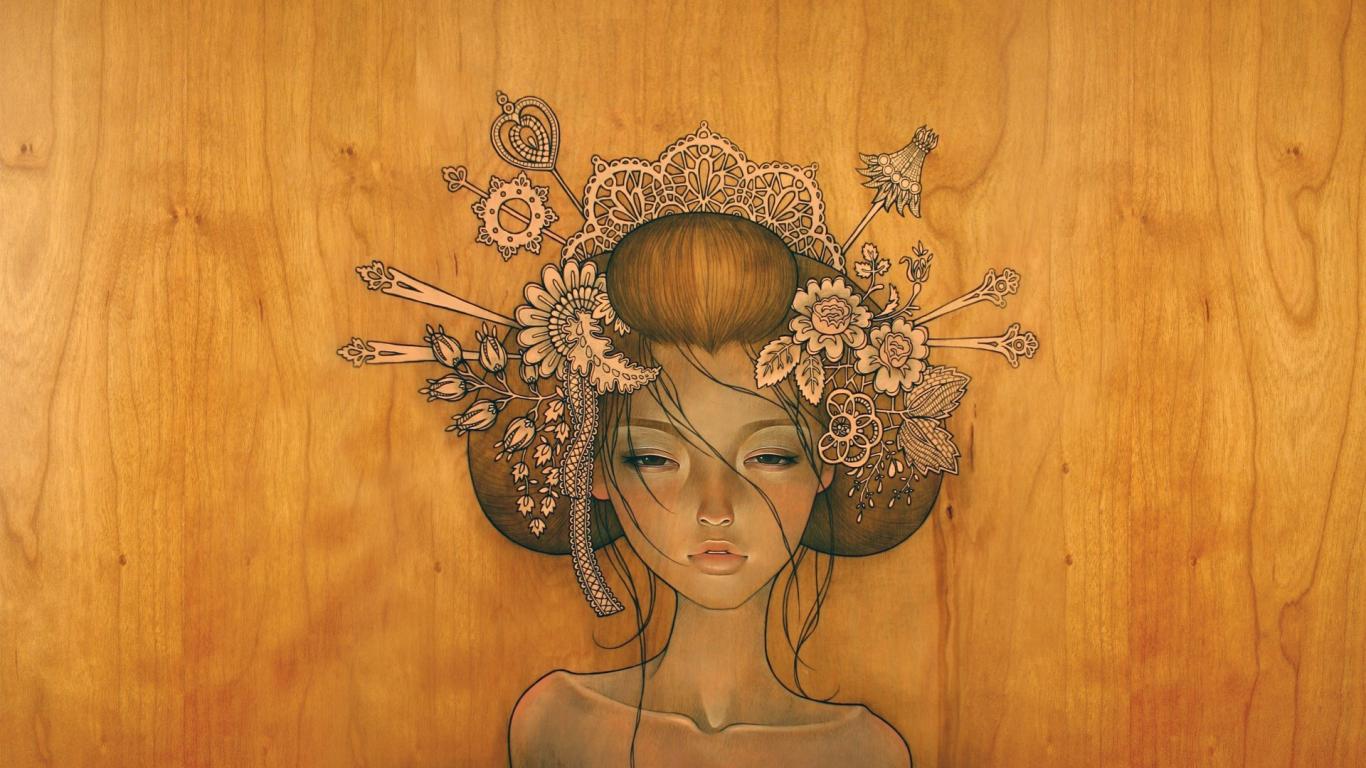Обои Девушка нарисованная на деревянной поверхности