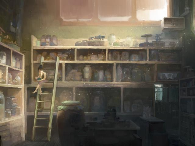 Обои Девушка читает книгу среди хаоса