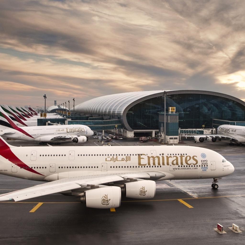 Обои Ряд самолетов Airbus A380 в аэропорту Дубаи