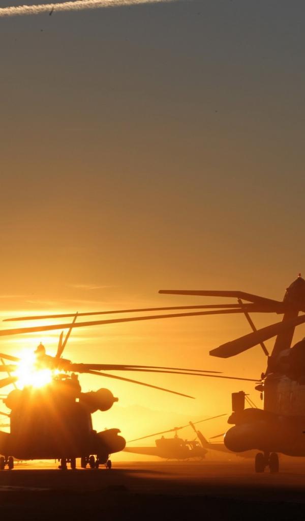 Обои Несколько вертолетов на фоне заката