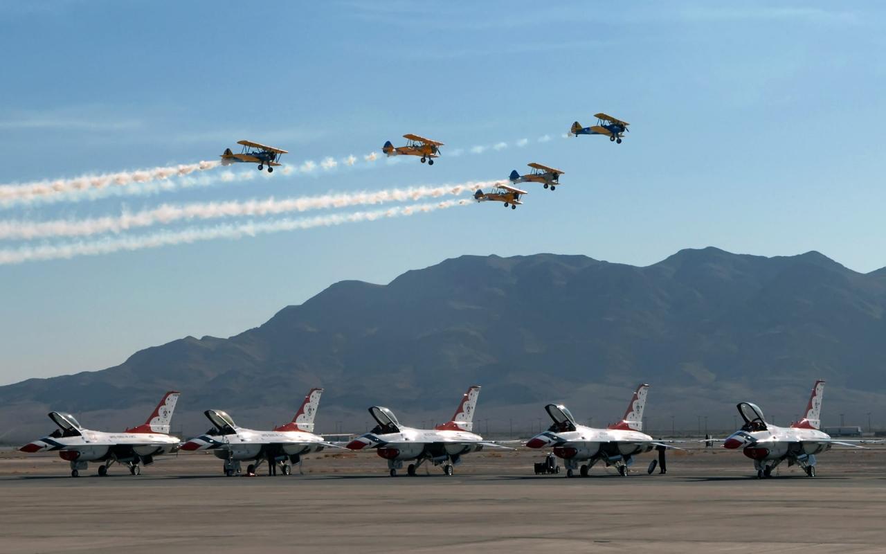 Обои Легкие одномоторные самолеты пролетают над военной базой
