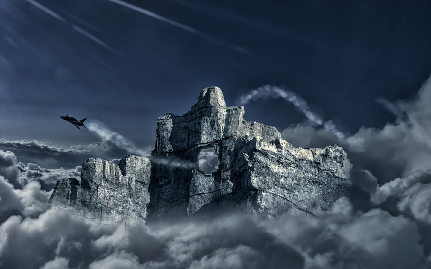 Обои Самолет пролетел сквозь отверстие в скале