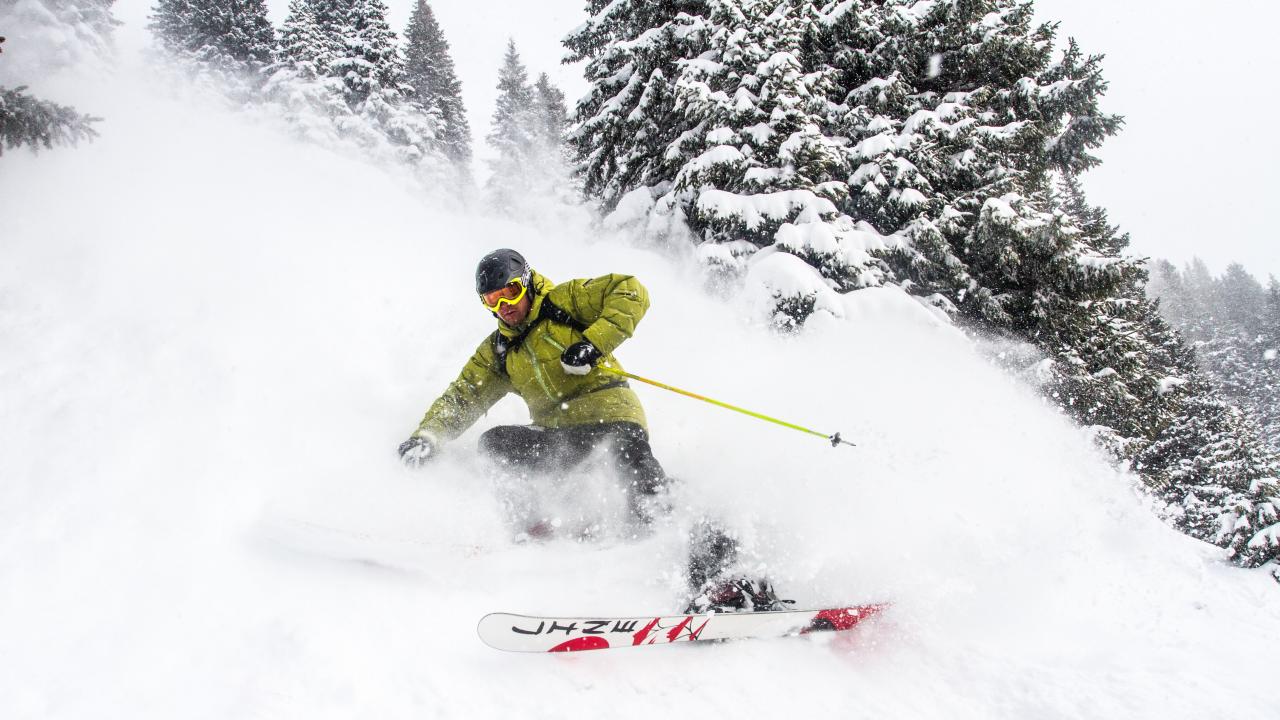 Обои Спортсмен лыжник спускается по заснеженному склону