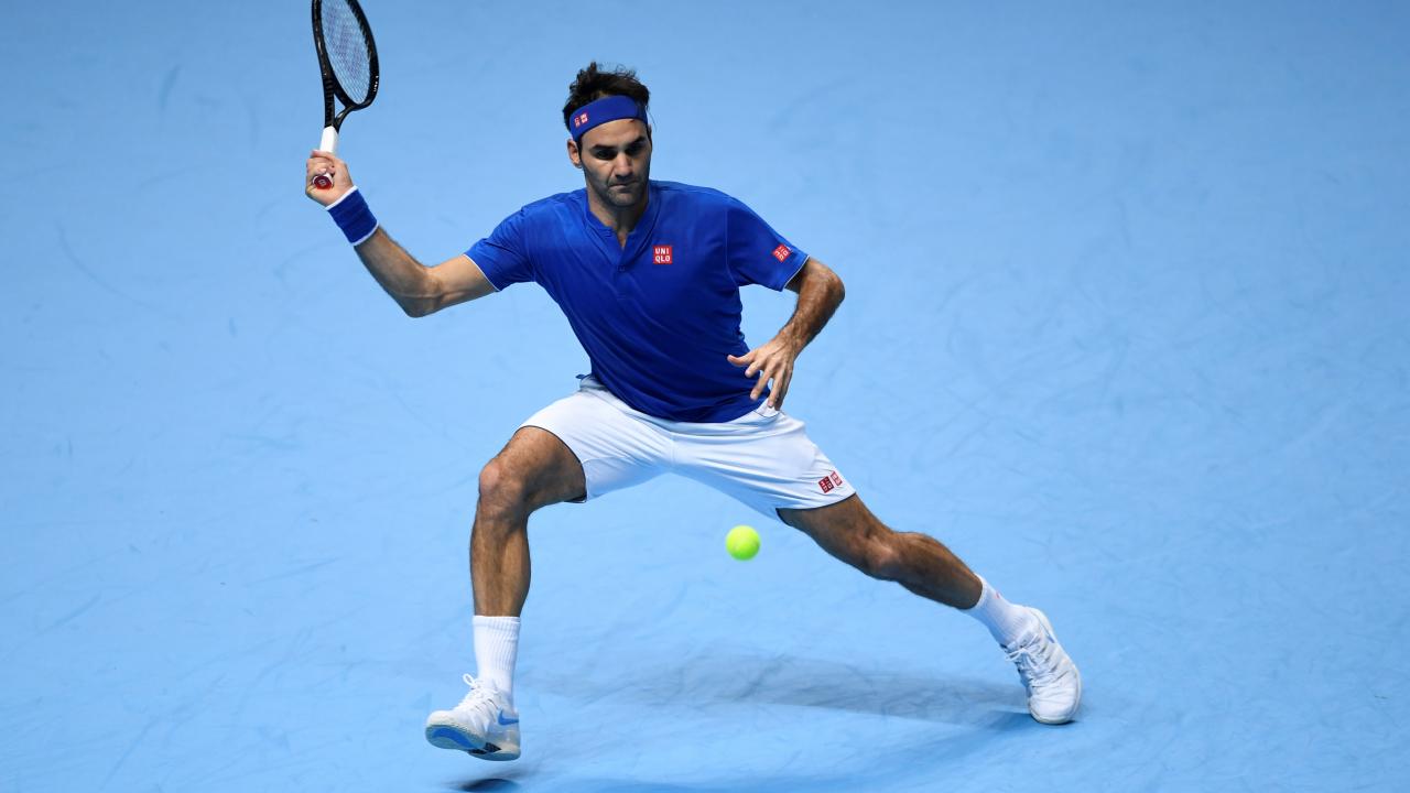 Обои Теннисист Роджер Федерер отбивает мяч ракеткой на корте