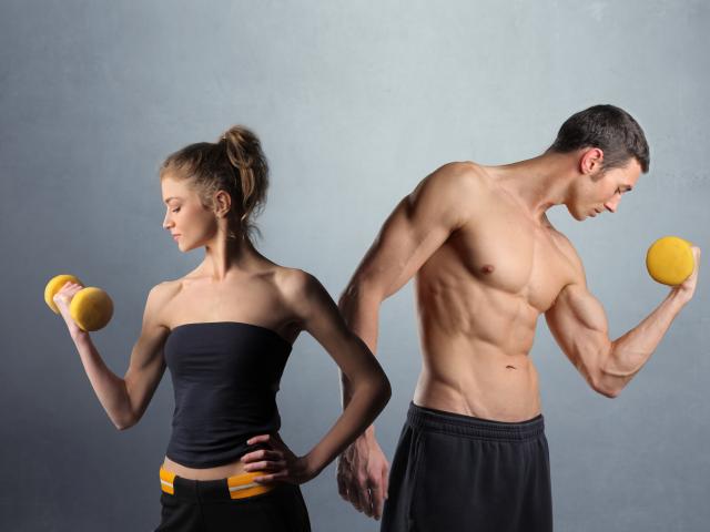 Обои Девушка и парень занимаются спортом с гантелями
