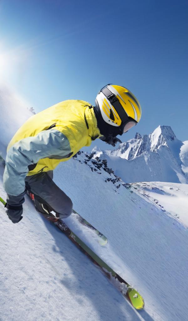 Обои Лыжник в шлеме спускается по заснеженному склону