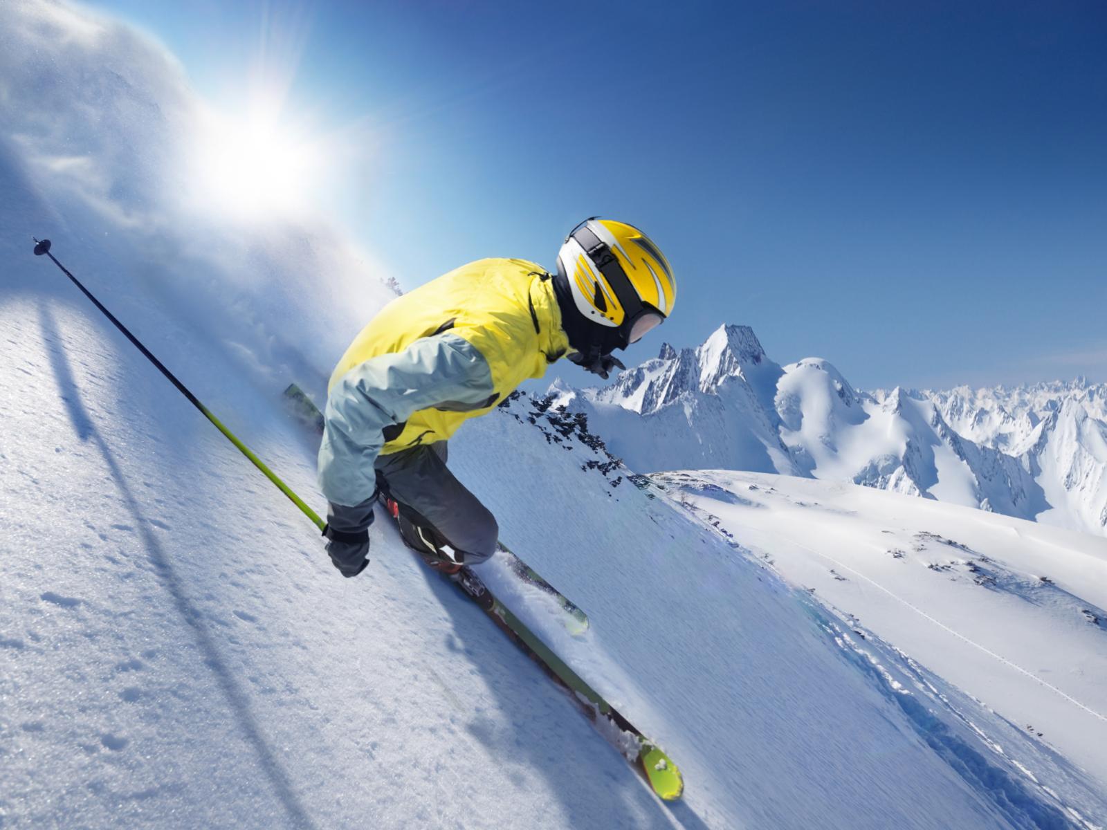 Обои Лыжник в шлеме спускается по заснеженному склону