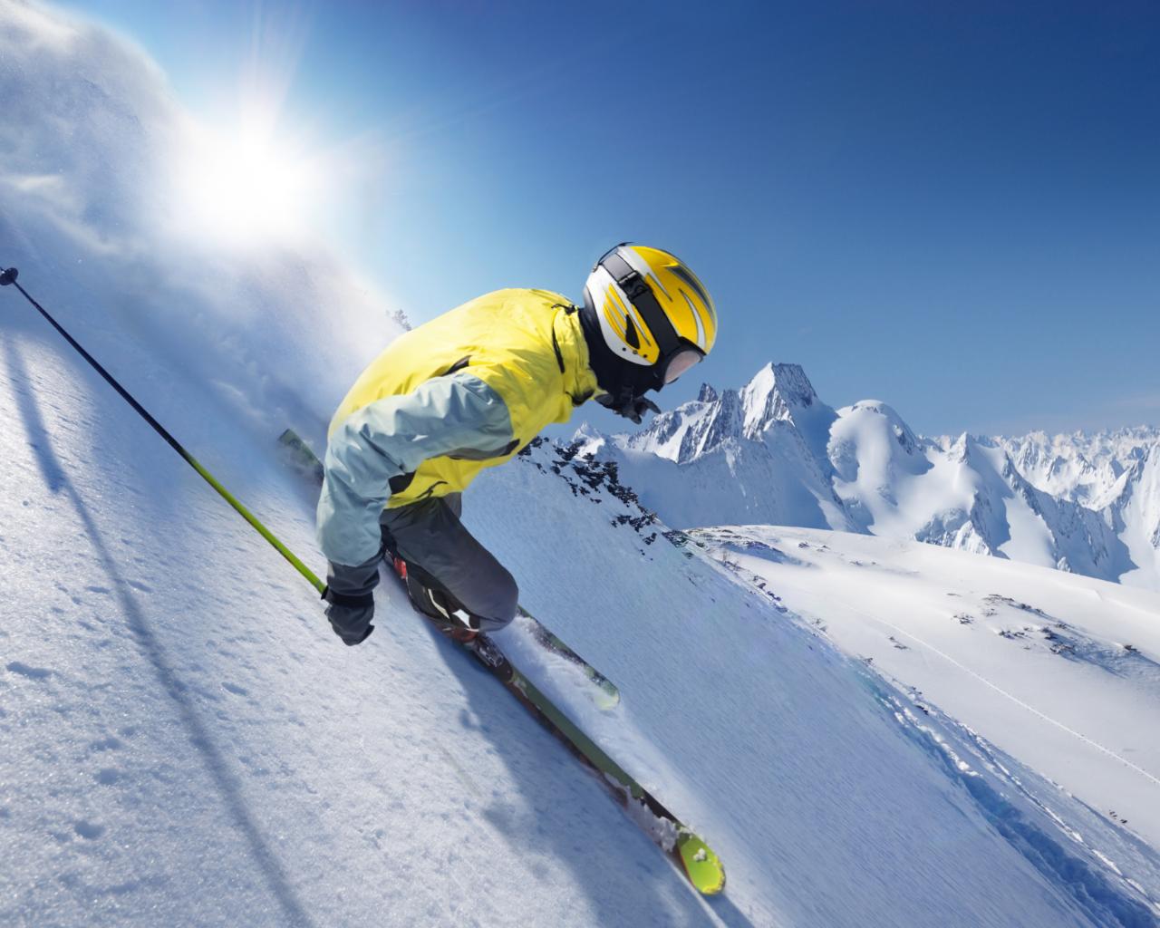 Обои Лыжник в шлеме спускается по заснеженному склону