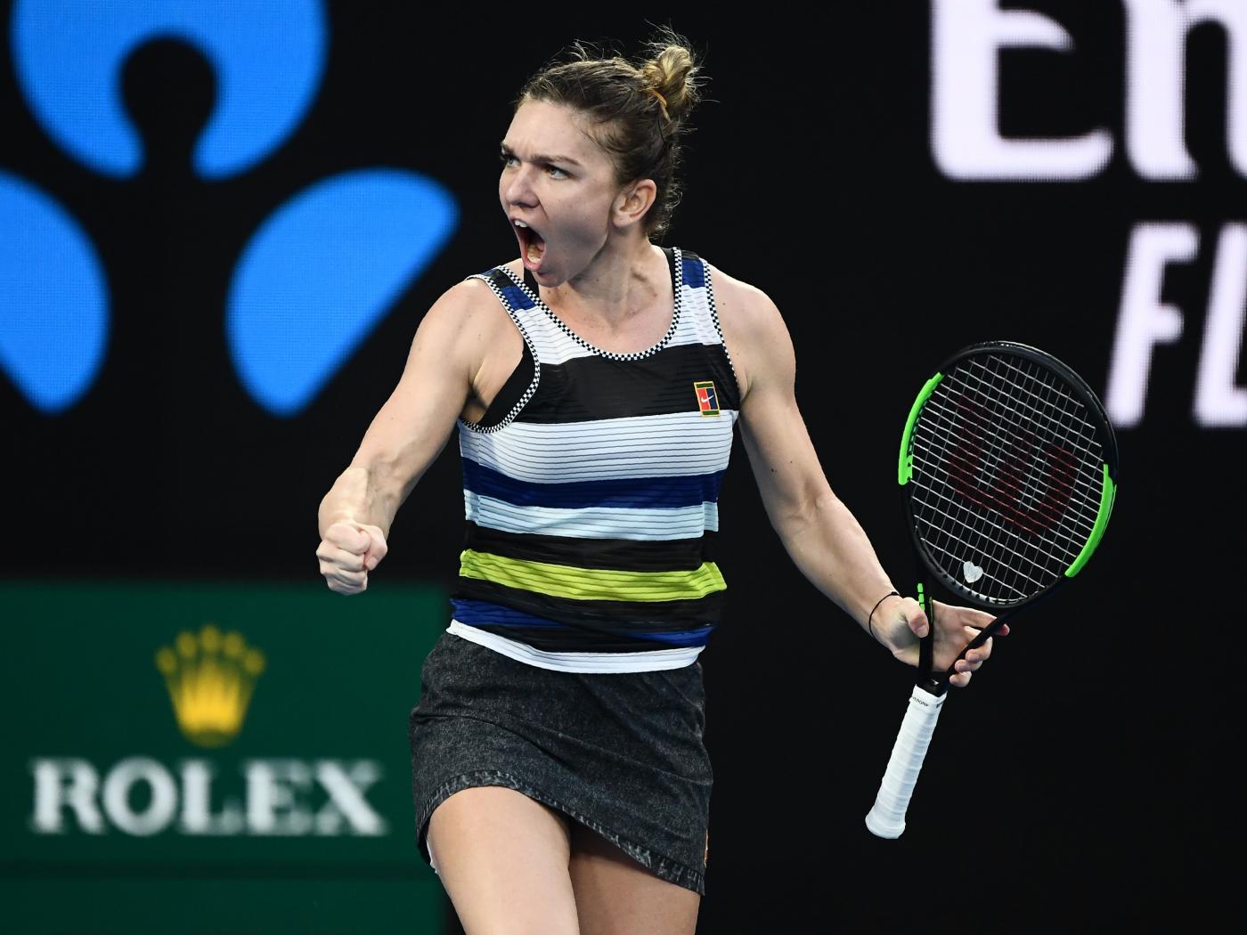Обои Румынская теннисистка Симона Халеп с ракеткой кричит на корте