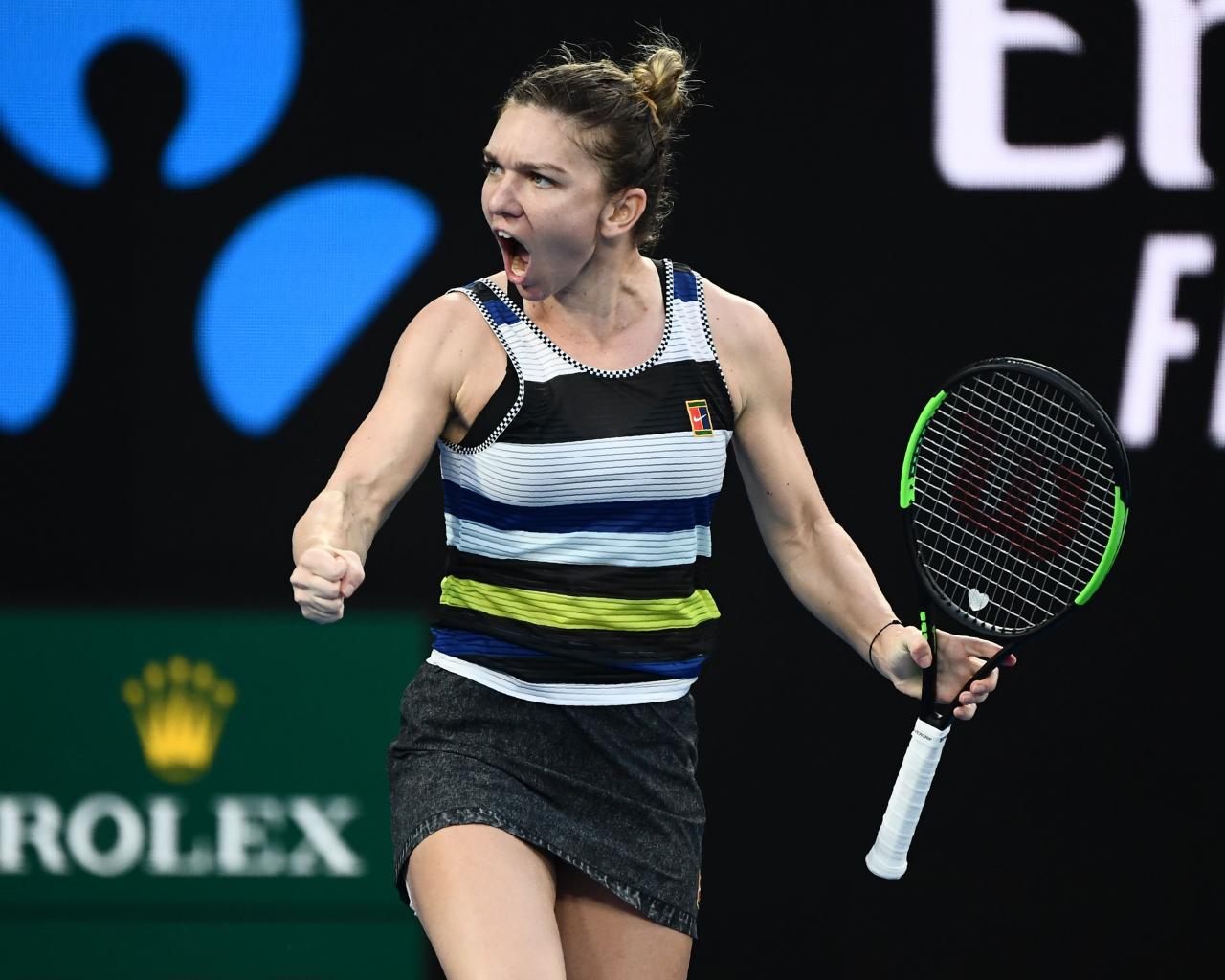 Обои Румынская теннисистка Симона Халеп с ракеткой кричит на корте