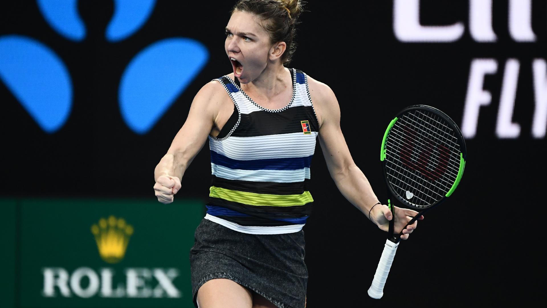 Обои Румынская теннисистка Симона Халеп с ракеткой кричит на корте
