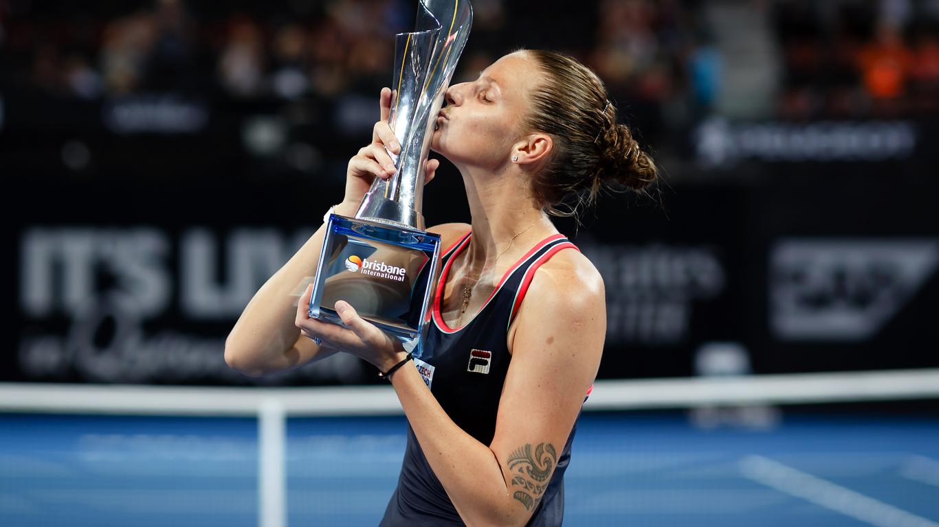 Обои Чешская теннисистка Каролина Плишкова целует кубок на корте