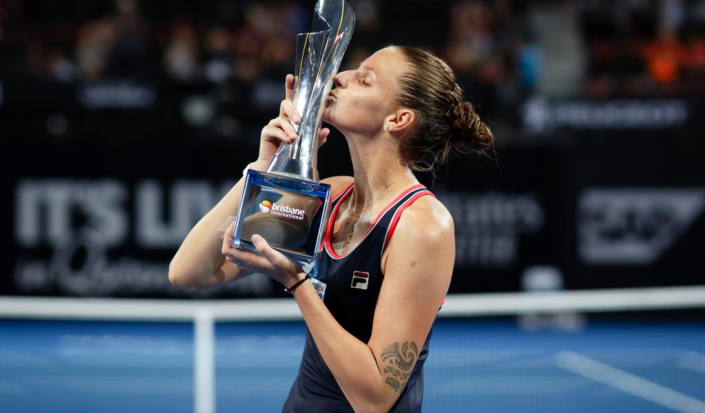 Обои Чешская теннисистка Каролина Плишкова целует кубок на корте