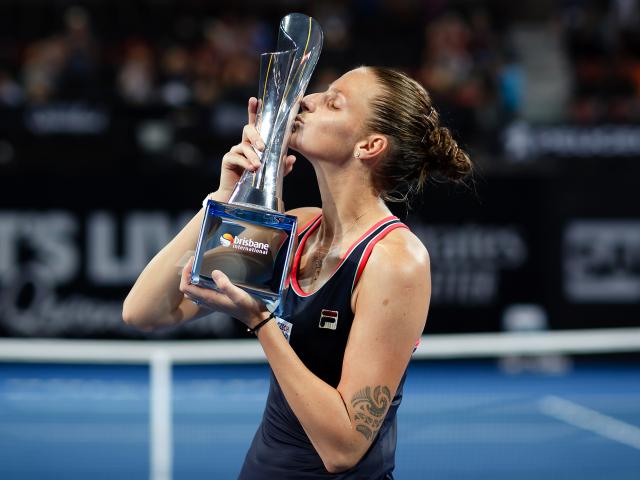 Обои Чешская теннисистка Каролина Плишкова целует кубок на корте