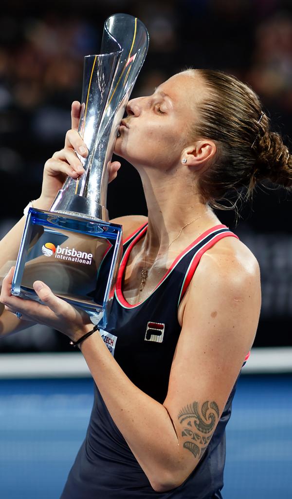Обои Чешская теннисистка Каролина Плишкова целует кубок на корте