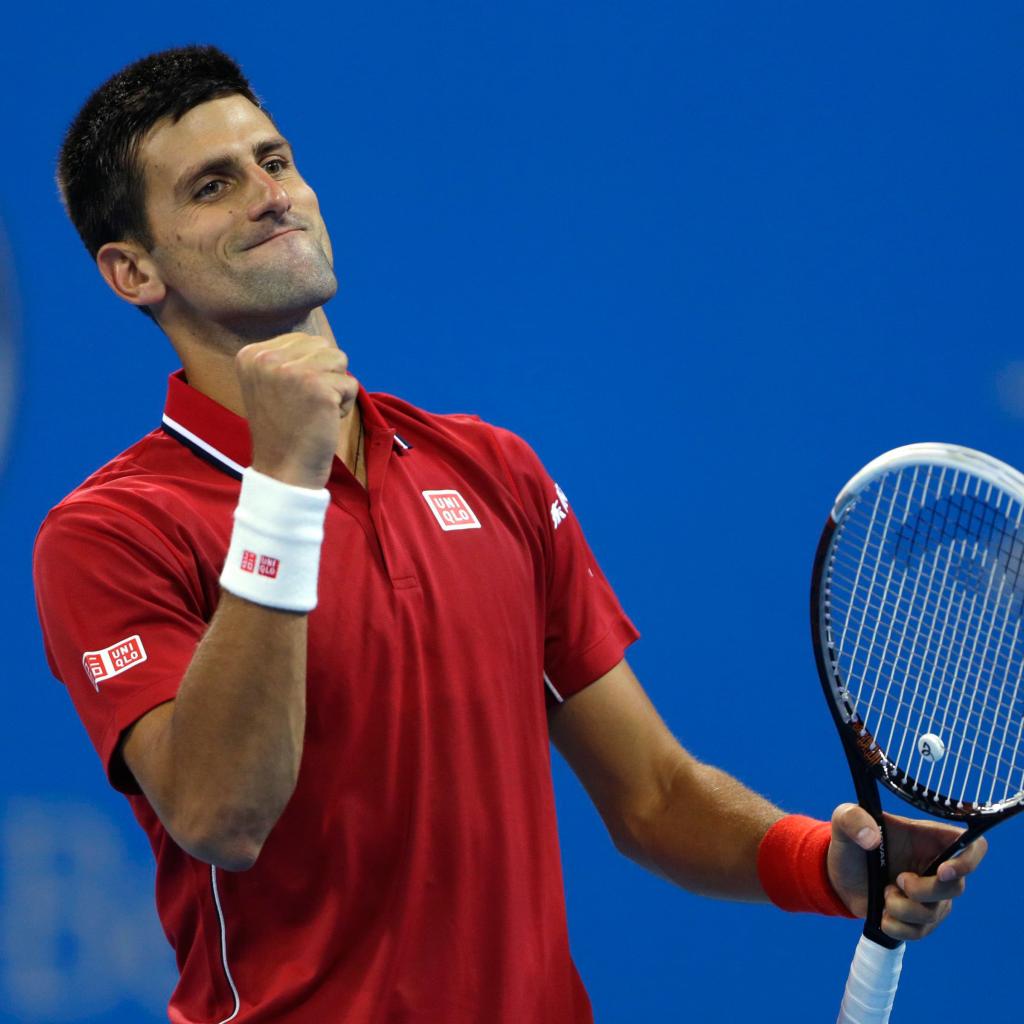 Обои Теннисист Новак Джокович с ракеткой радуется на корте