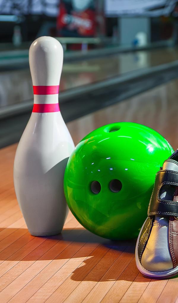 Обои Синие кроссовки, шар и кегля на дорожке для боулинга