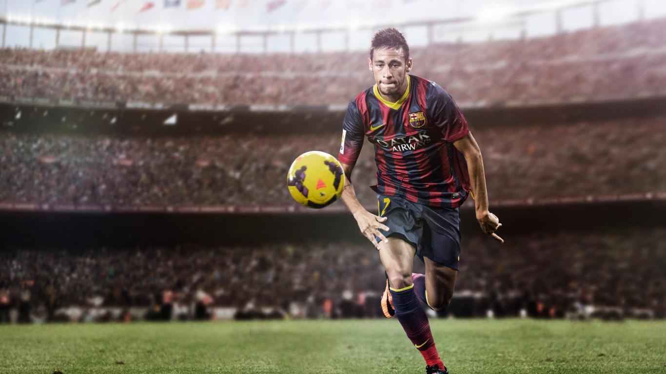 Обои Футболист Неймар на футбольном поле с мячом