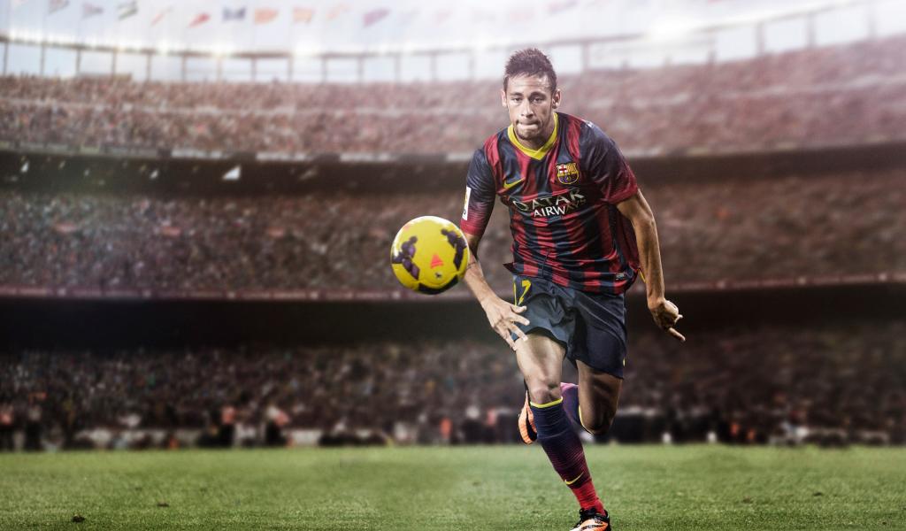 Обои Футболист Неймар на футбольном поле с мячом
