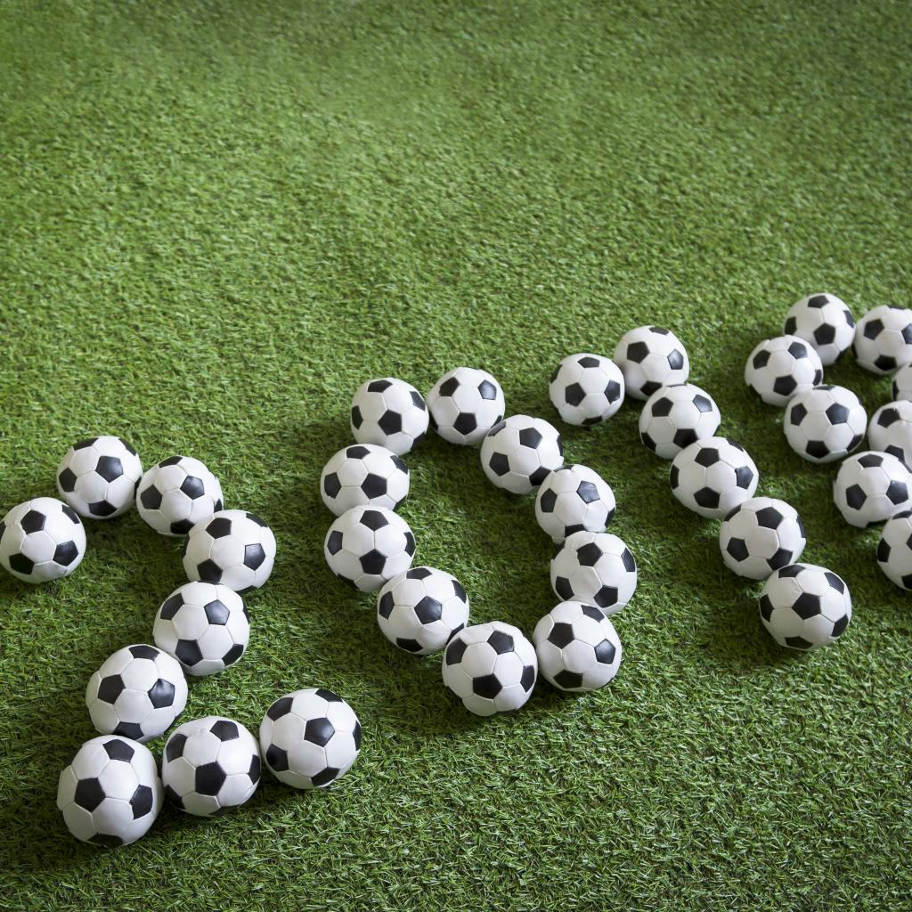 Обои Цифры 2018 из футбольных мячей на зеленой траве