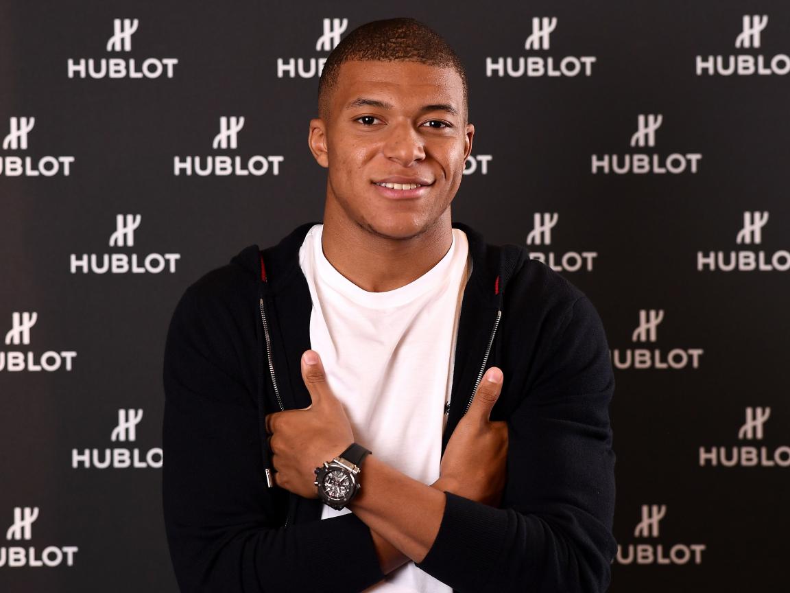 Обои Футболист Килиан Мбаппе в костюме с часами на руке