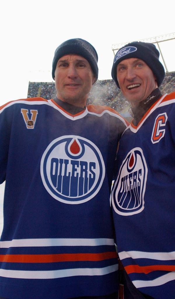 Обои Хоккеисты Пол Коффи, Уэйн Гретцки позируют для фото
